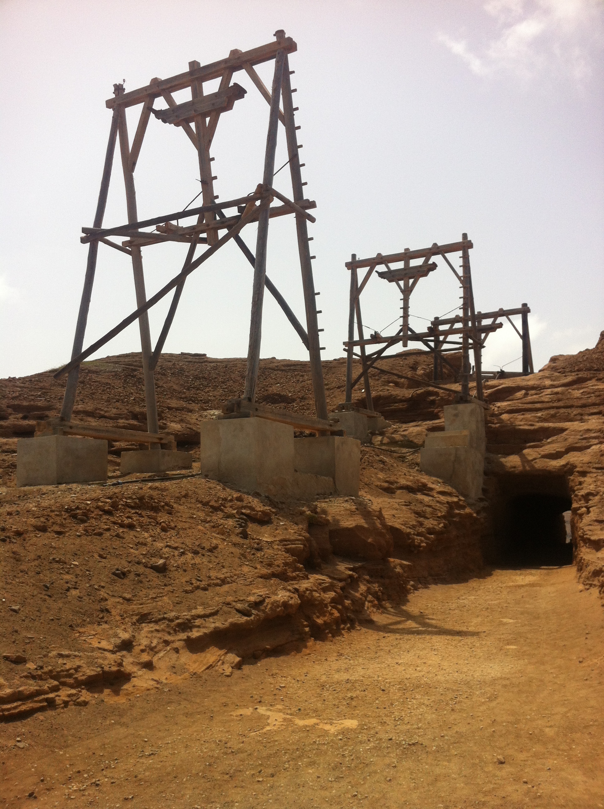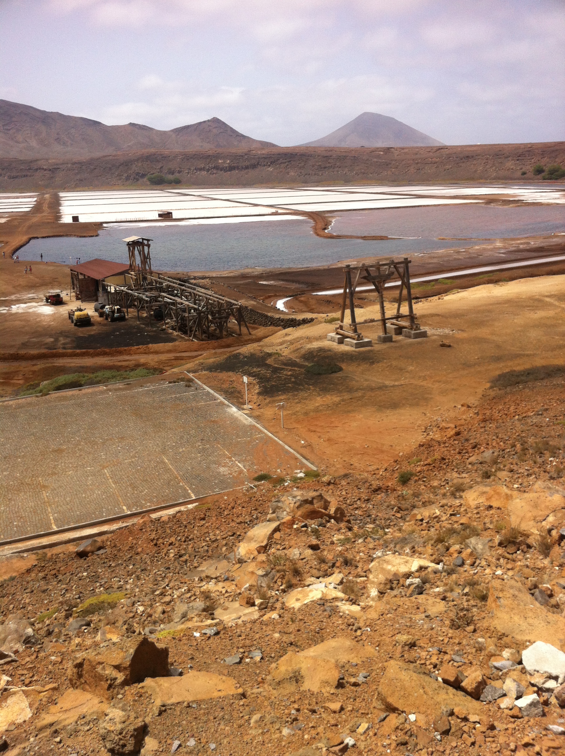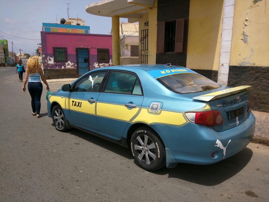 From Espargos we took a taxi to Pedro Da Lume (tell the driver you want to go to to the Salinas) to go and see the salt mines (Sal got its name because it used to produce so much salt). The official taxis look like this, and most have the name or nickname of the driver on the back. This one that I’m walking in front of says ‘No Stress’ which is the thing that everyone says in Sal (like their version of ‘Jamaica No Problem’)