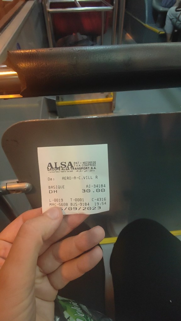 Anyways, I had booked a hostel for 2 nights in the medina of Marrakesh and I’d read online that the cheapest way to get there from the airport would be the bus. It was easy to find a bus stop and there was a super friendly staff member standing outside the bus who told me the price and which stop I’d have to get off at etc. The ticket was 30 Dirhams which was actually a return ticket (you can’t buy a one-way one apparently), and I used Google Maps to walk from the bus stop to my hostel.