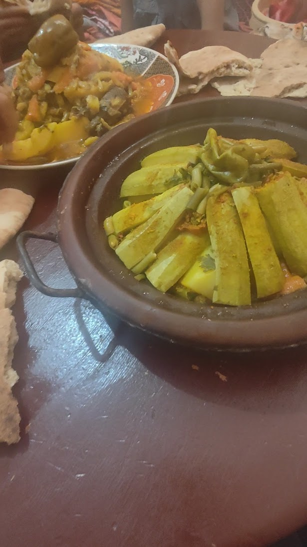 Breakfast was mostly bread with olives, olive oil (the olive oil there was amazing), dates (there’s an abundance of dates in Morocco near the desert), honey etc. Lunch was always tagine (a meat one and then a separate vegetable one for me and the German girl because she also doesn’t eat meat), and then dinner was something like couscous with meat/vegetables, soup and bread, or pasta with a kind of tomato/vegetable sauce (with a bit of meat for the others).