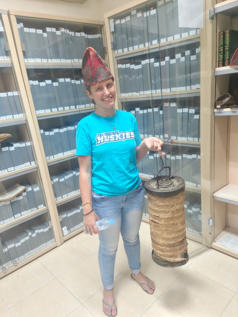 After about 10 minutes we arrived at this supposedly ancient library, which must have been refurbished because it didn’t look particularly old. It turns out it’s more of a museum now. There were some local antique items in a display, and lots of old books, but there weren’t any information boards or anything so it was a bit strange. There was a sign on the cupboards indicating that photos weren’t allowed, but the old man opened one of the display cabinets to put an ancient hat on my head and get me to hold an old lamp!