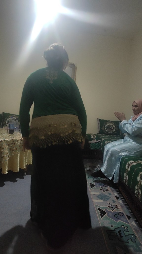 Again I was given a local outfit to wear, and they played some Moroccan music through the speakers. The niece had a kind of belt with little things attached which shake around and make noise when you move (I think she was wearing it at the wedding), so she was basically the centre of attention because she kept shaking her hips with the belt thing on. I was very happy to just take the role of clapping while she was doing this!